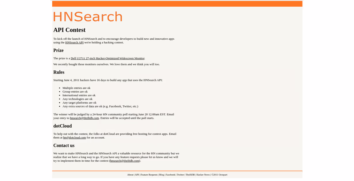 The official launch of HNSearch was posted by Paul Graham, founder of Y-Combinator itself (aka pg), and Andres Morey, founder of Octopart (W07) (aka andres), separately on June 4, 2011. Andres posted it as an API contest here to build the best thing on top of the HNSearch API where the winner would get a 27-inch Dell monitor. PG posted it as an official announcement on HN here which linked to ycombinator.com in a now only archive-available page.
